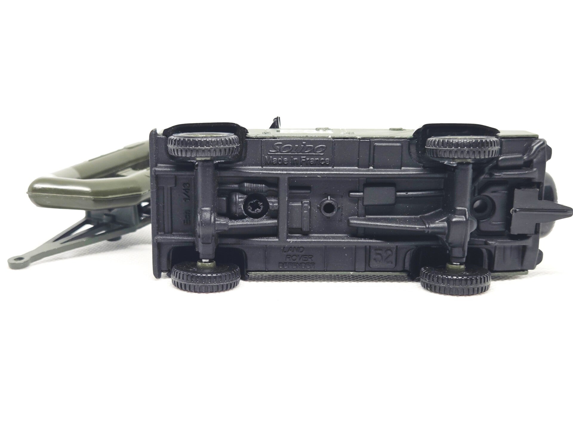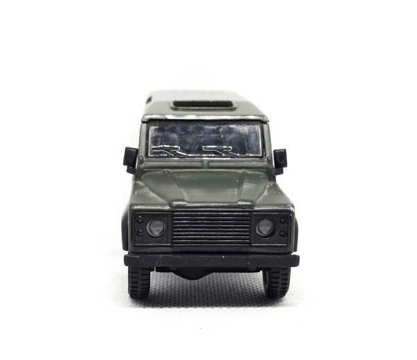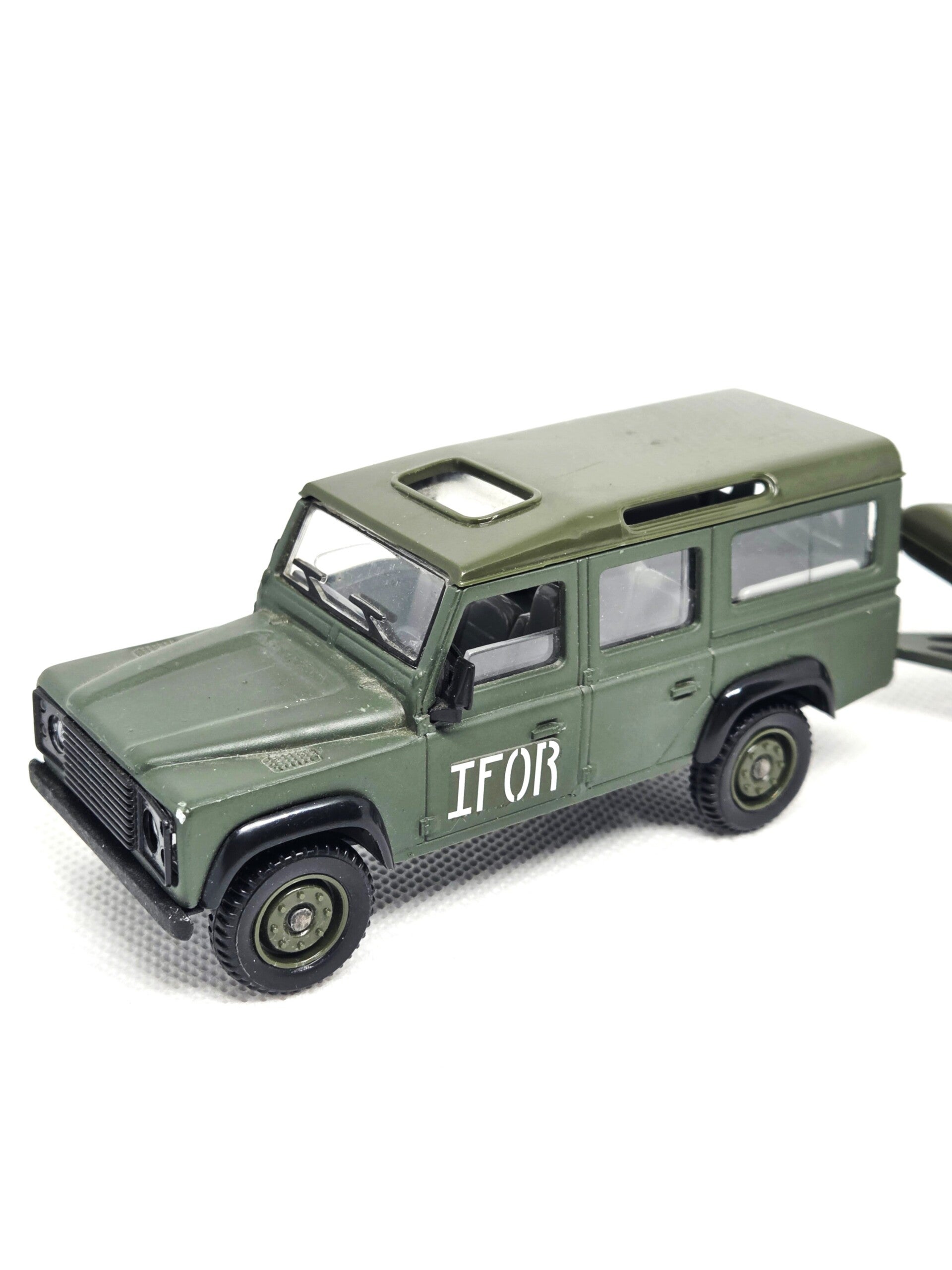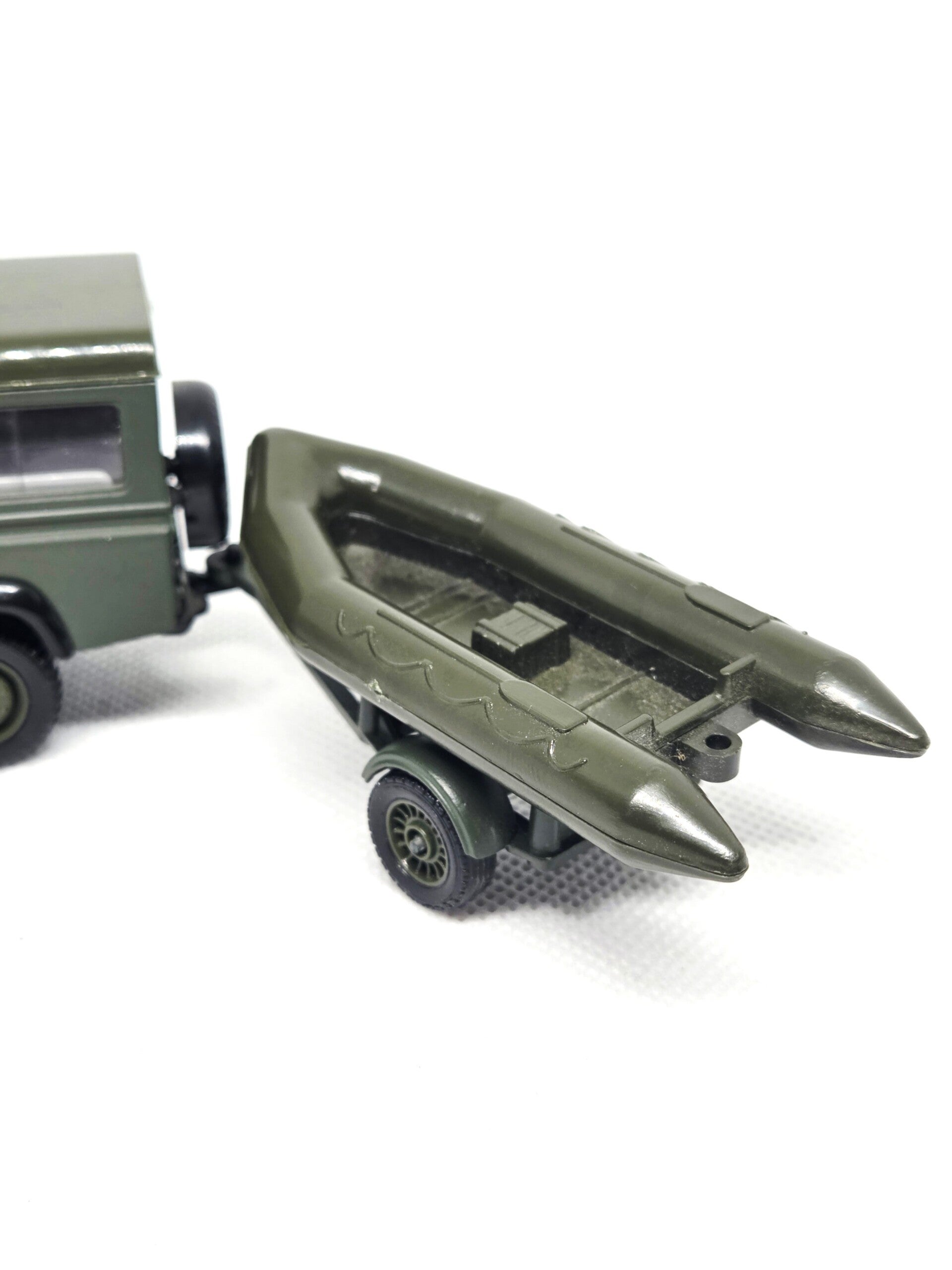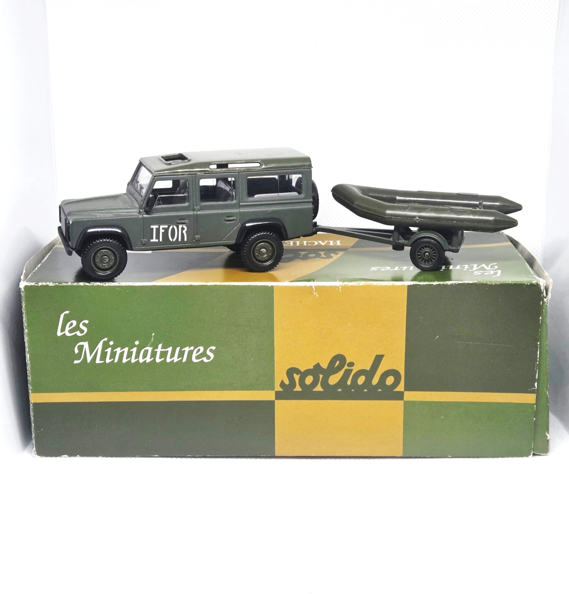 In uitstekende staat, schaal 1/43.Model: Land Rover Defender (IFOR).3 delen in totaal: Voeruig, aanhangwagen en zodiac.
